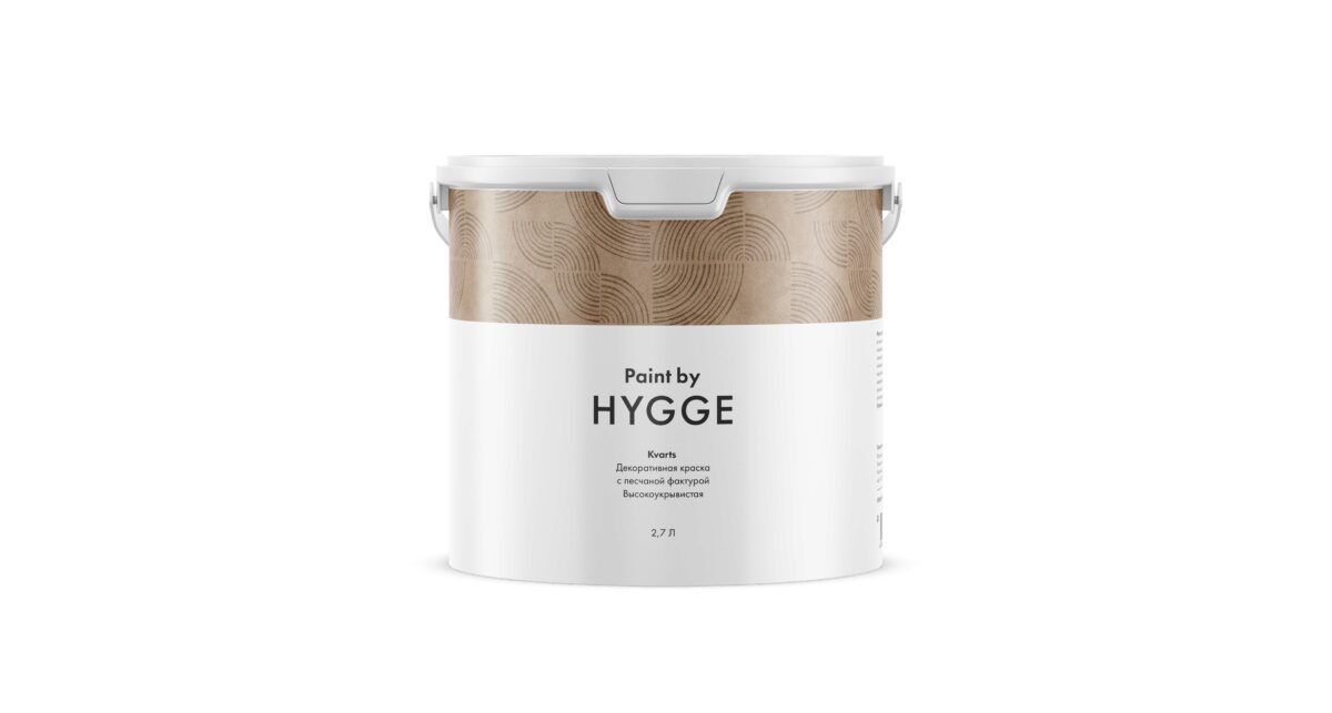- HYGGE Paint Kvarts 2,7 л. Высокоукрывистая декоративная краска с песчаной фактурой. При нанесении образует различные эффекты на поверхности: бетон, сатинирование, песочные микроструктуры.